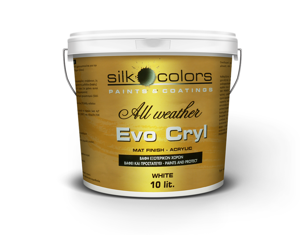 Το Evo Cryl All Weather είναι ειδικά σχεδιασµένο για όλες τις συνθήκες περιβάλλοντος. Τα χαρακτηριστικά του προσδίδουν, άριστη συμπεριφορά, σε χαμηλές και υψηλές, θερμοκρασίες (από -15oC έως +50oC )έχει αντοχή στο νερό για κάθετες επιφάνειες, προσφέρει αντοχή στην υπεριώδη ακτινοβολία, και στη διατήρηση του χρώματος.